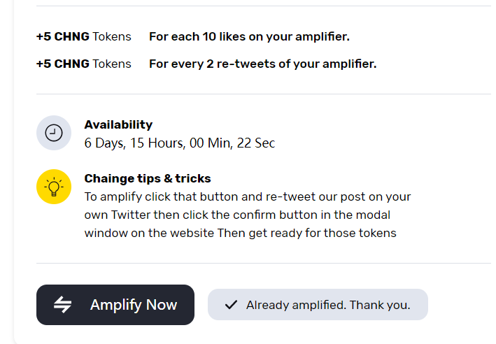 Chuyện là hiện giờ CHNG đang muốn mở rộng quảng bá nên có nhiệm vụ đi retweet, quảng bá áp phích về nó, nếu Amplifier của bạn được 2 retweet bạn sẽ được 5 CHNG, nếu được 10 like bạn cũng sẽ được 5 CHNG.