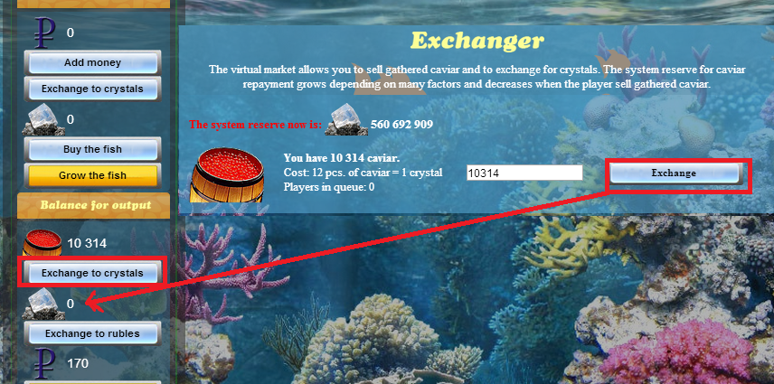 Sell crystals to rub to withdraw or exchange to the similar crystals intended for purchase of fishes