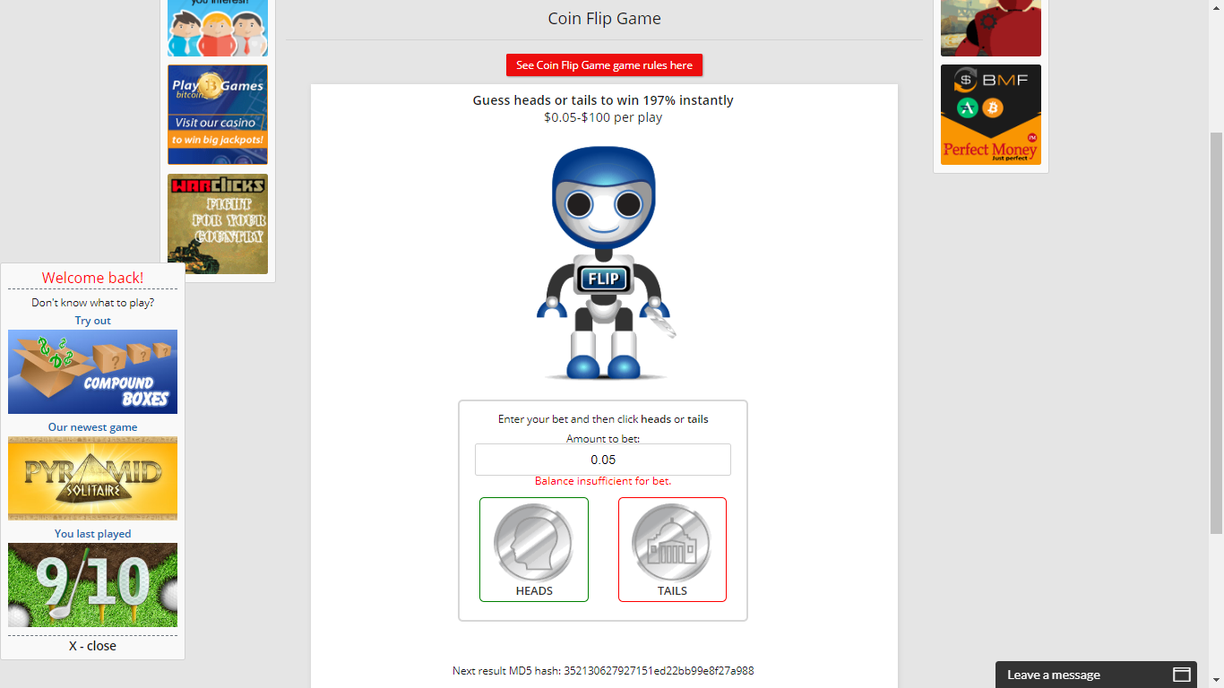 1. trò flip như bạn kia giới thiệu đặt 1$ win=1,97$ ( trừ 1$ gốc còn có 97% mà bạn kia bảo 197%)như vậy về lâu dài kì vọng nhà cái hơn 0.03$ ( ví dụ nếu tôi và bạn lật đồng xu 1 ván 1k mà tài khoản ai cũng có khỏang 1m đi, bạn win tôi đưa bạn 970đ, bạn thua đưa tôi 1k