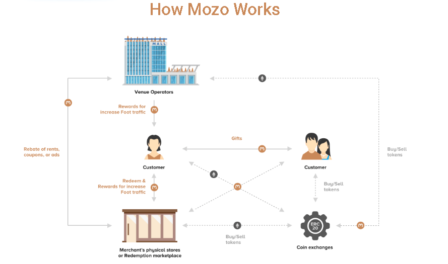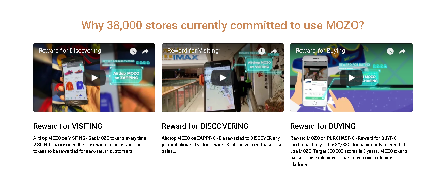Đặc biệt hơn là Mozo cung cấp và tặng quà cho các khách hàng tham gia mua sắm tại những nơi có chấp nhận thanh toán với Mozo. Tại đây khách hàng có thể tích lũy Mozo tokens và được sử dụng Mozo token đó thanh toán vào giao dịch đã mua sắm. Việc tiếp cận khách hàng ở các điểm bán lẻ lớn nhỏ mang lại nguồn khách hàng tiềm năng và độ phổ biến rất lớn cho Mozo trong tương lai