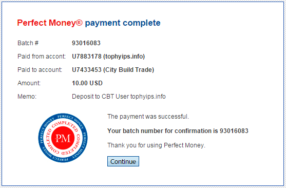 The amount of 10.5 USD has been deposited to your Perfect Money account. Accounts: U7433453->U7883178. Memo: API Payment. Withdraw to tophyips.info from CBT.. Date: 21:51 03.07.15. Batch: 93779245.
