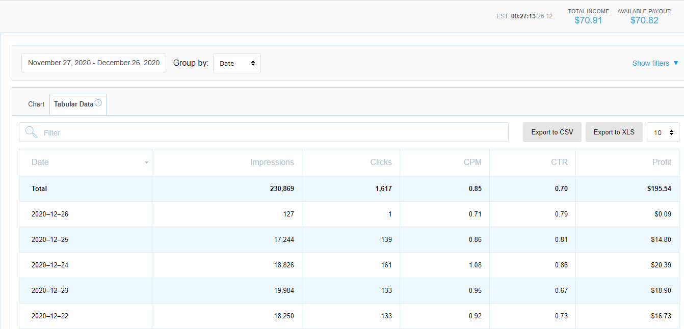 traffic bác tầm bao nhiêu, em có site traffic khoảng 4 - 5k user 1 ngày chơi cái này thì liệu được bao nhiêu hả bácchạy vài hôm. mình chỉ để poup nhảy hạn chế. ko cho nhảy tràn lan như ngày đầu. 2 hôm đầu nhảy add trang. Mấy hôm sau mình cho khi xem 1 vài trang mới nhảy nên poup nhảy ra ít hơn. nhưng CPM vầy vẫn ăn đứt bọn adskeeper đối với Tranff từ VN 99% như mình.