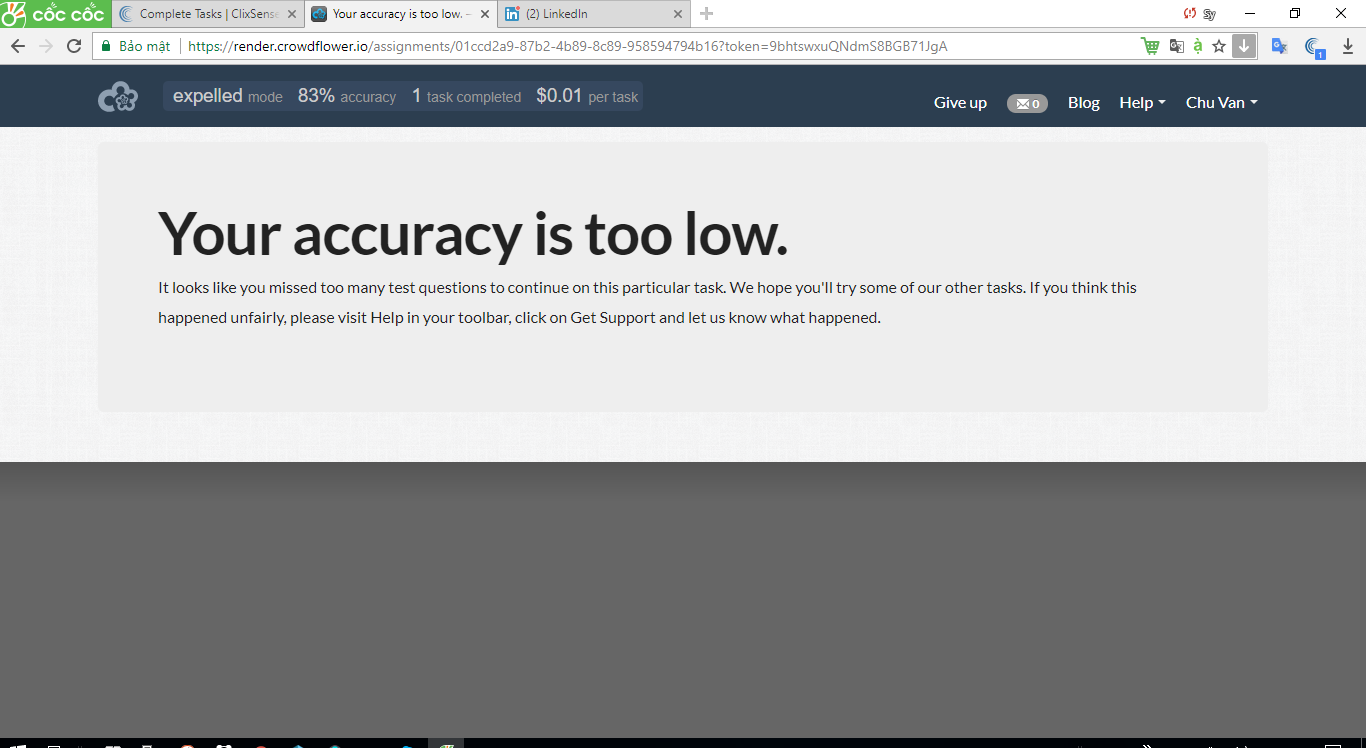 đến sang năm cũng không lên được levelcó a bị giống mình không...đang làm task lv1 accuracy 72 %..ma bị tụt xuống lv 0...accuracy 83% bị expell mới hay chứ