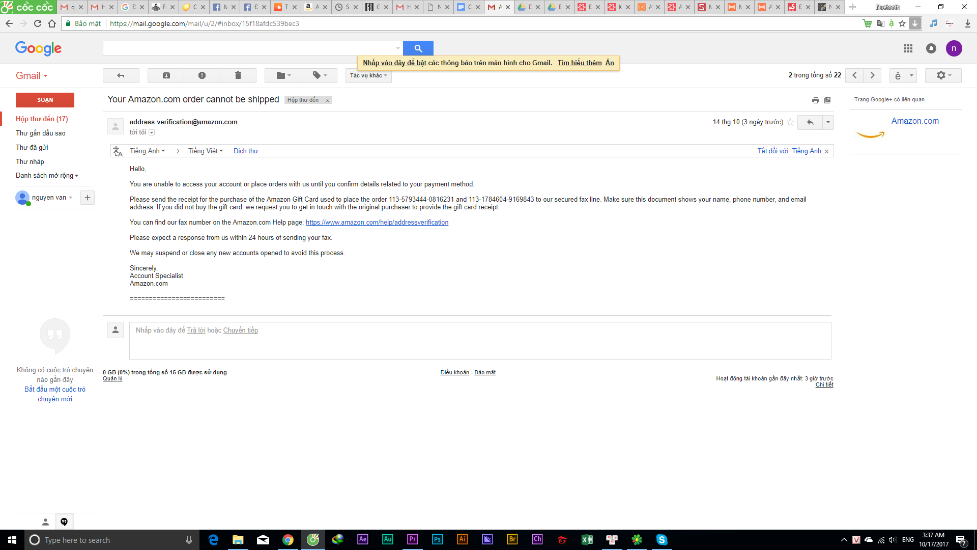 Liệu có chắc rằng cái hóa đơn ID đó là cho cái gift card mà bạn mua của thớt không?bác đang hỏi lỗi có phải do gift k thì đấy là bằng chứng do gift, AMZ n đòi hoá đơn và các bằng chứng liên quan đến cái gift e đã nạp đấy