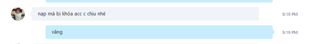 - Mình đã 2 lần nói về việc acc lock thì buyer chịu. Đã một lần từ chối bán khi buyer có nói là lấy một acc trust 7 năm của ông anh ra nạp. Đã có nói là nạp code có nguy cơ bị lock acc. Mình thực sự đã rất clear về việc sẽ bị lock acc và không muốn bán. Mình chỉ bán khi buyer gặng hỏi mua và mình có deal là acc lock buyer chịu, deal này được nhắc đến 2 lần.