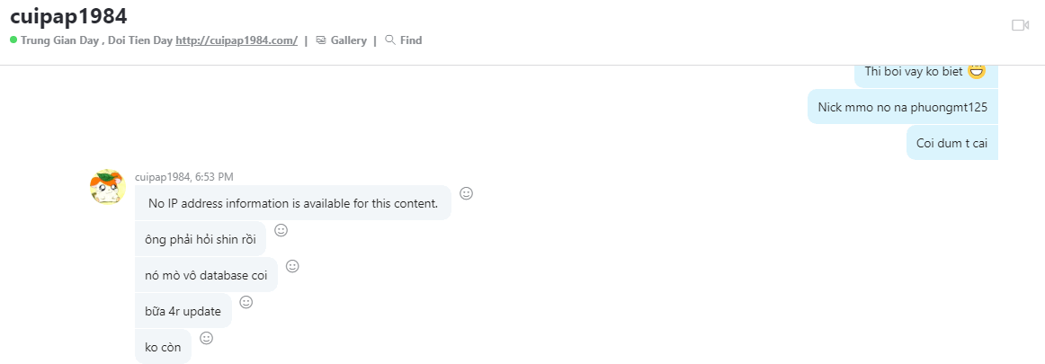 Sau một hồi nói chuyện này kia với @cuipap1984 mình hỏi ổng có check được IP của thằng scammer phuongmt125 này không (Topic scam này: https://mmo4me.com/threads/scam-vcb-0801000277372-nguyen-van-tuan.386523/), ổng nói "bữa update ... shin nó mới coi dc thôi", nhưng khi mình nói "Tai box scam, t thay ban tung post IP cua mem khac ra ma", ổng mới bảo rằng "xem dc".