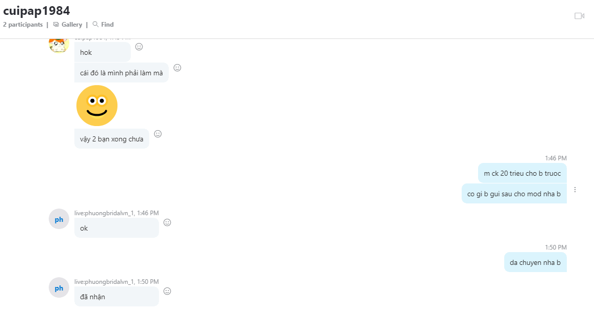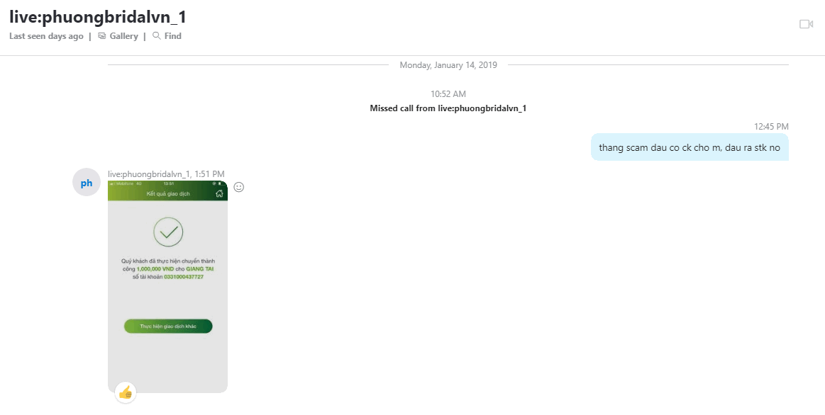 Nhưng phuongmt125 vẫn chuyển khoản 1 triệu VND đó cho cuipap1984 sau đó, mình biết vậy bởi nó gửi screenshot điện thoại chuyển khoản cho mình.