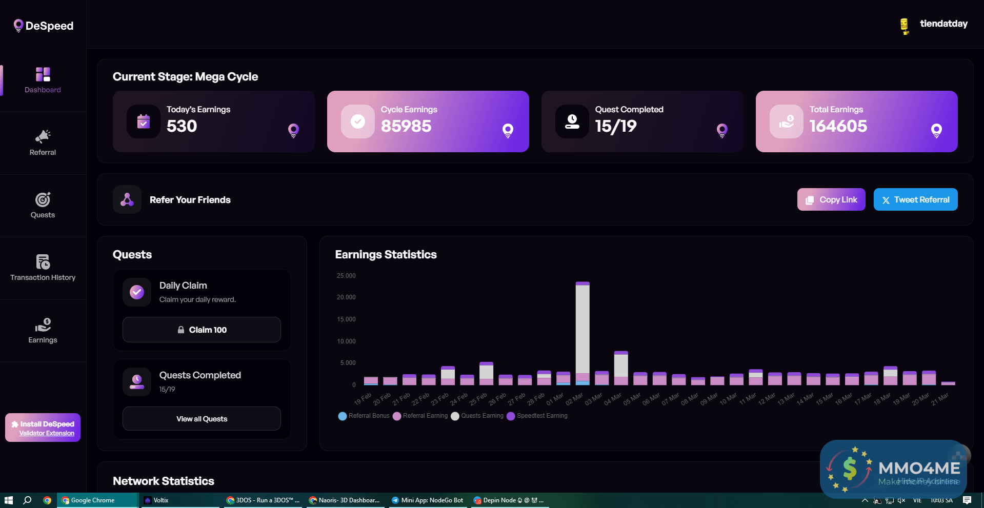 Hướng dẫn Đi tới: https://app.despeed.net/register?ref=ta8Lx5a0Qyrv Đăng ký bằng địa chỉ email của bạn => vào email xác minh. ae tải tiện ích: DeSpeed Validator - Chrome Web Store Earn rewards effortlessly by contributing to the DeSpeed network. chromewebstore.google.com Sau khi tải xuống, hãy kiểm tra ứng dụng tiện ích mở rộng của bạn, nhấp vào "Despeed validator" và đăng nhập bằng địa chỉ email của bạn. Claim hàng ngày Kéo xuống làm các nhiệm vụ Hoàn thành.