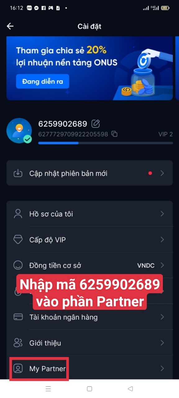 Đối với ai đã có tài khoản Onus rồi thì nhập mã 6259902689 vào phần Partner