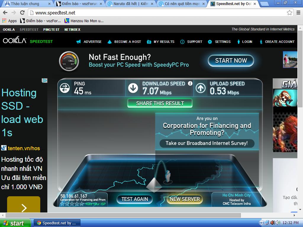 Quá chậm so với FPT ... nhìn hình nè .. mình đóng 240 ngàn luôn VAT .. nói thì nói thế tést thế này ko chính xác đâu chính xác nhất là download 1 file là chính xác nhất . Nhà mình vào gói 6Mbps .. nhưng sau này dc tặng thêm 2Mbps => 8Mpbs nhưng mà test chỉ có 7Mbps do trừ hao ..
