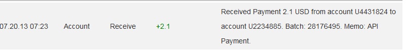 [TD]Received Payment 2.1 USD from account U4431824 to account U2234885. Batch: 28176495. Memo: API Payment. [/TD]