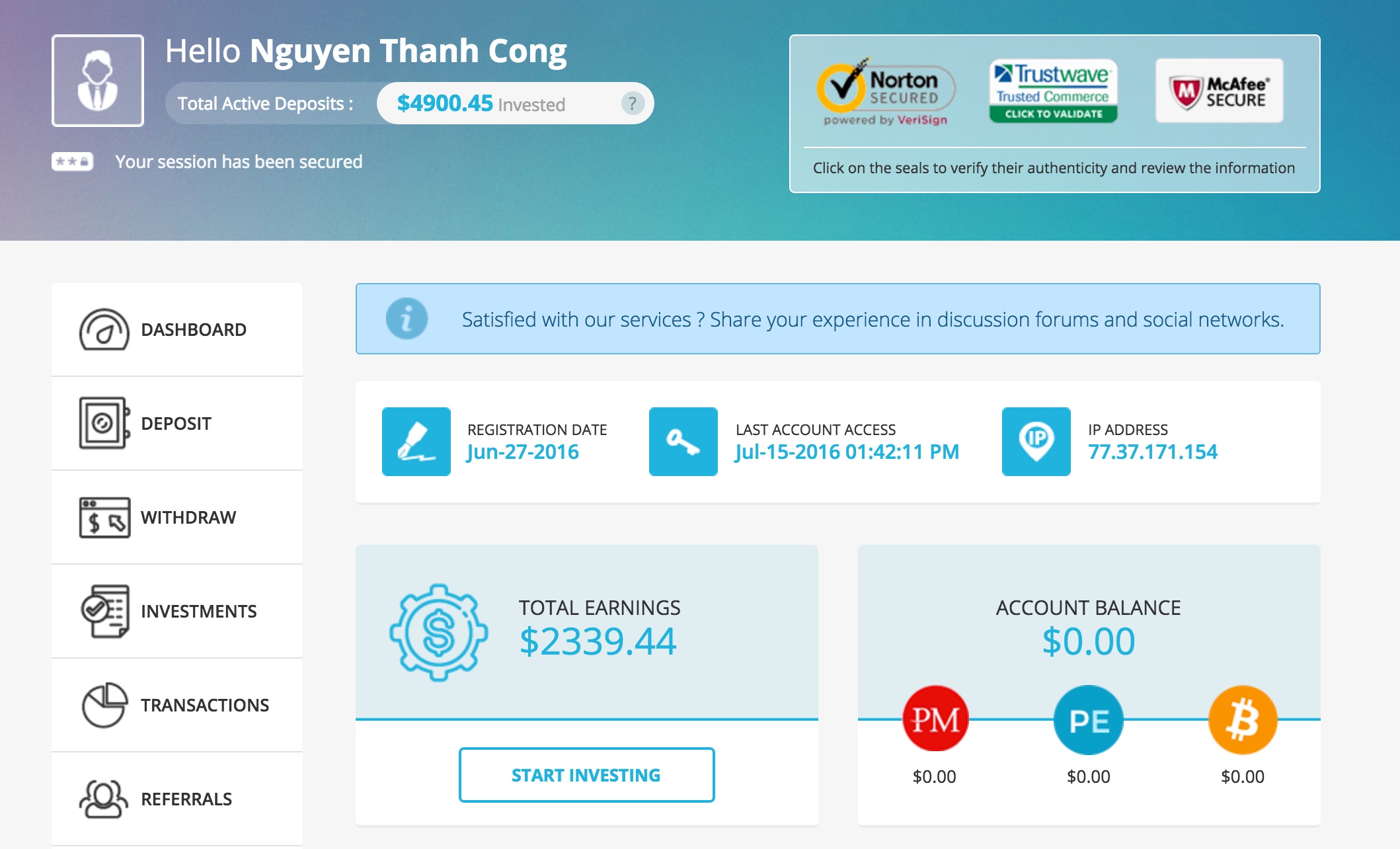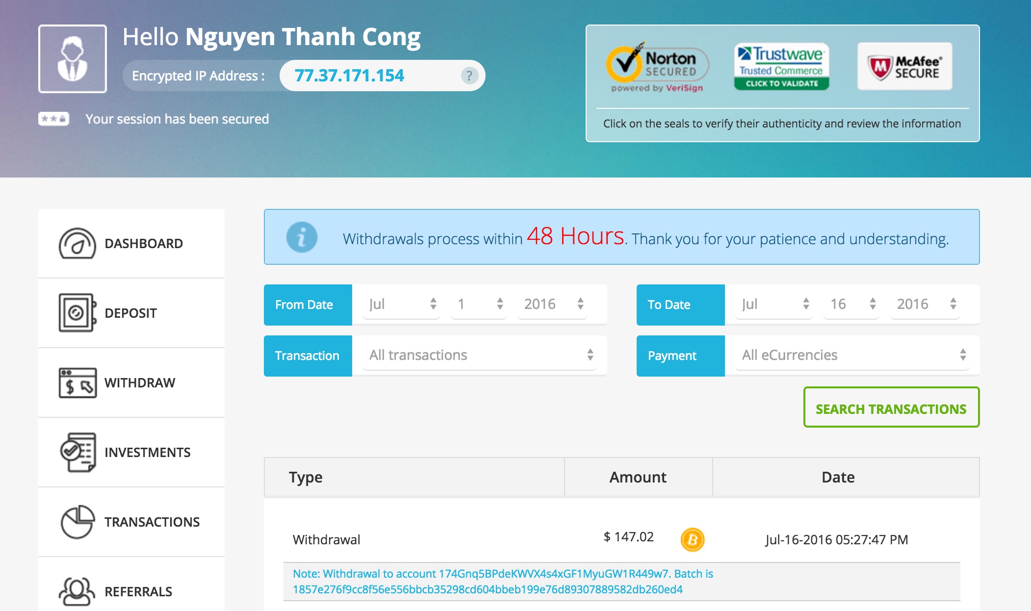The amount of 4.5 USD has been deposited to your Perfect Money account. Accounts: U9155290->U1896276. Memo: API Payment. Withdraw to C1722645 from Coince.. Date: 23:05 16.07.16. Batch: 139988217.