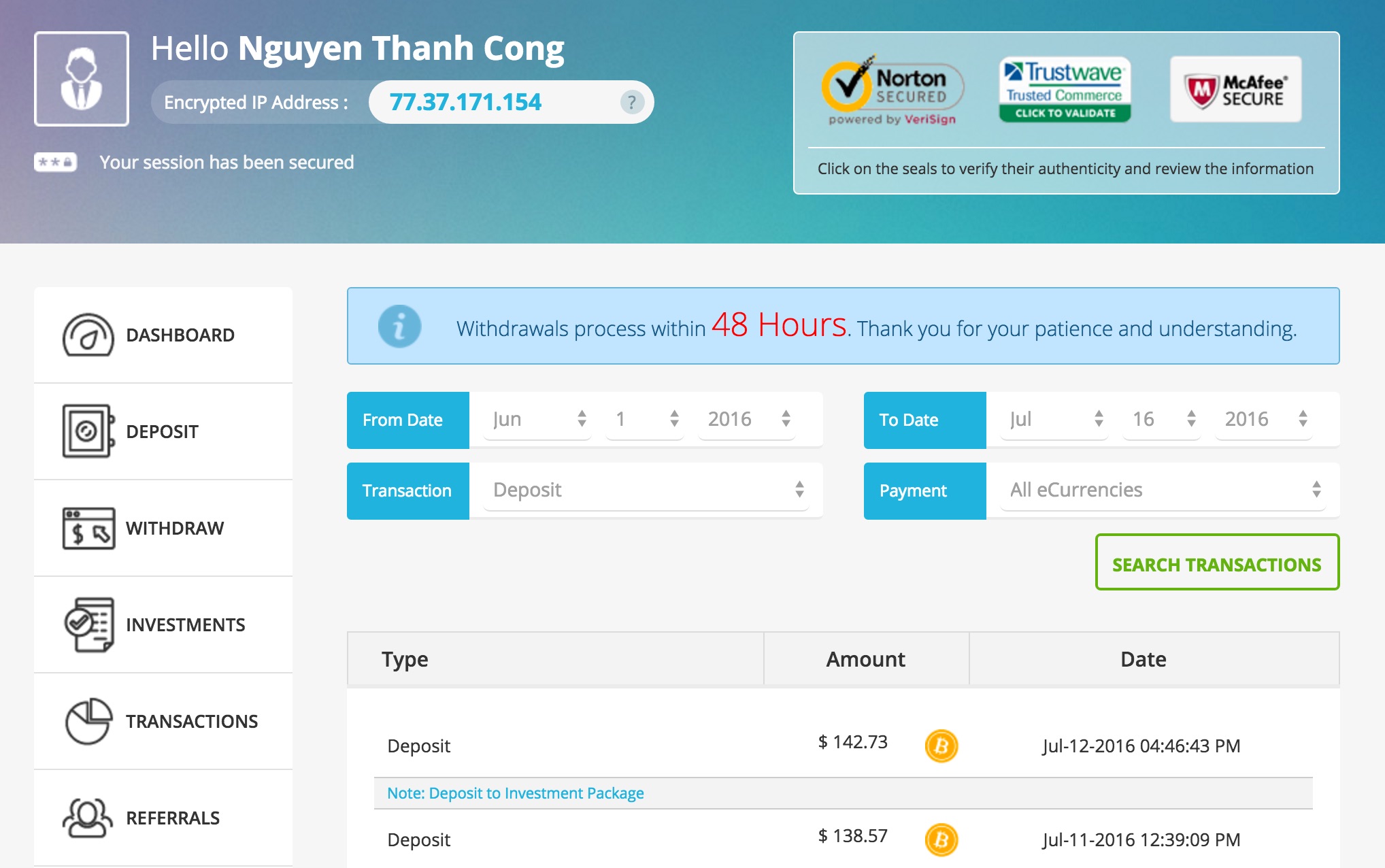 The amount of 5 USD has been deposited to your Perfect Money account. Accounts: U9155290->U1896276. Memo: API Payment. Withdraw to C1722645 from Coince.. Date: 19:31 15.07.16. Batch: 139888159.