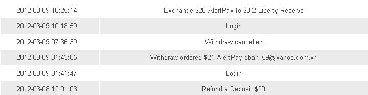 Đầu tiên là lỗi do mình, đăng ký tài khoản mà nhìn không kỹ nên ghi lầm email, rồi deposit vô đó 5$ AlertPay, sau đó quên password không recover pass được. Vậy là mình lật đật gửi mail cho Support của nó bằng cách dùng chức năng Contact Us trên website --> không thấy hồi âm. Mình mới nhào vô Online Chat nói chiện với nó, chỉ nhận được mỗi yêu cầu gửi mail đi. Mình cũng hoảng quá chưa biết làm sao, tại ít chơi HYIP lắm, cũng sợ mất tiền vớ vẩn. Nhớ ra là có cái Payment Receipt email của AlertPay gửi về lúc dep vô 5$ nên forward nguyên cái email đó cho Support của nó, gửi lần một --> chờ 2-3 tiếng không thấy trả lời, tức quá gửi lần 2 thì nó mới báo là sẽ thay đổi email cho mình trong vòng 72 giờ. Bây giờ đã được 36 tiếng, mình đang chờ nó giải quyết xem sao. Lưu ý là thằng này bảo là dịch vụ hỗ trợ 24/7, mà nhờ nó hỗ trợ là y như rằng phải nhờ vả nên bực lắm...Vài lời chia sẻ với anh em.