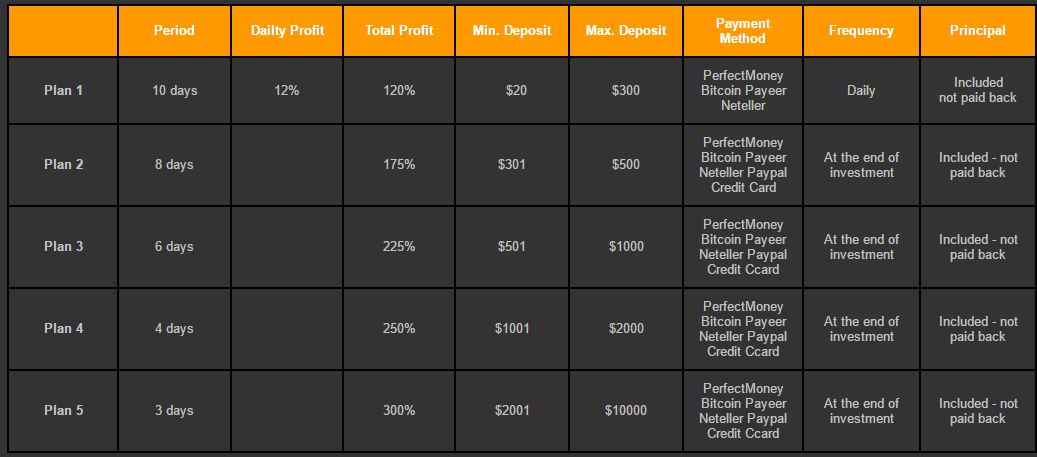 Investment Plans: 12% daily for 10 days, 175% after 8 days, 225% after 6 days, 250% after 4 days and 300% after 3 days