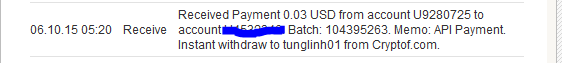 CongratzReceived Payment 0.03 USD from account U9280725. Memo: API Payment. Instant withdraw to robinsupham from Cryptof.com.