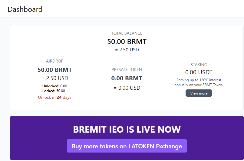 Mấy hôm nay em tìm được kèo trên Bremit khá ngon, khi đăng ký lần đầu các bạn nhận được 50 BRMT và khi tuyển ref các bạn được nhận thêm 10 BRMT. Hiện tại thì coin này đang có giá 0.05 USD. Nhưng 10/10 chuẩn bị tới có đợt mở bán vòng 3 thì coin này có thể lên cao nữa, theo thông tin em cập nhật được và khá chắc kèo. Nên các bạn hãy tích BRMT bây giờ. Đăng ký như sau: