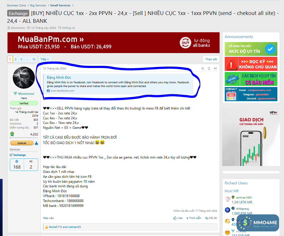 em không biết tại sao để bị hách FB và đến thời điểm hiện tại trên link exchange của Đức vẫn ghim nick fb, không gỡ đi, vậy mục đính là gì? tại sao vẫn chưa có cảnh báo lên mmo4me cho mọi ngườiView attachment 287614