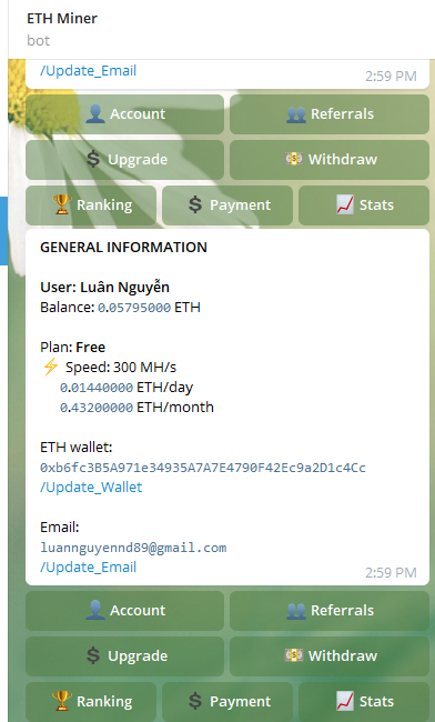 Bước 3: Lấy ví ETH Bước 4: Vào Link: https://t.me/ETH_Miner_sg_bot?start=1181868112