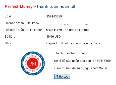 The amount of 8.4 USD has been deposited to your account. Accounts: U13611479->U2917300. Memo: API Payment. Withdraw to hyipregular1 from DDFutures.com.. Date: 13:34 01.05.18. Batch: 213407659.