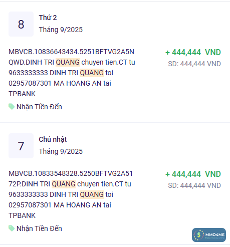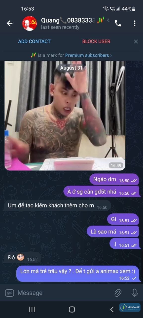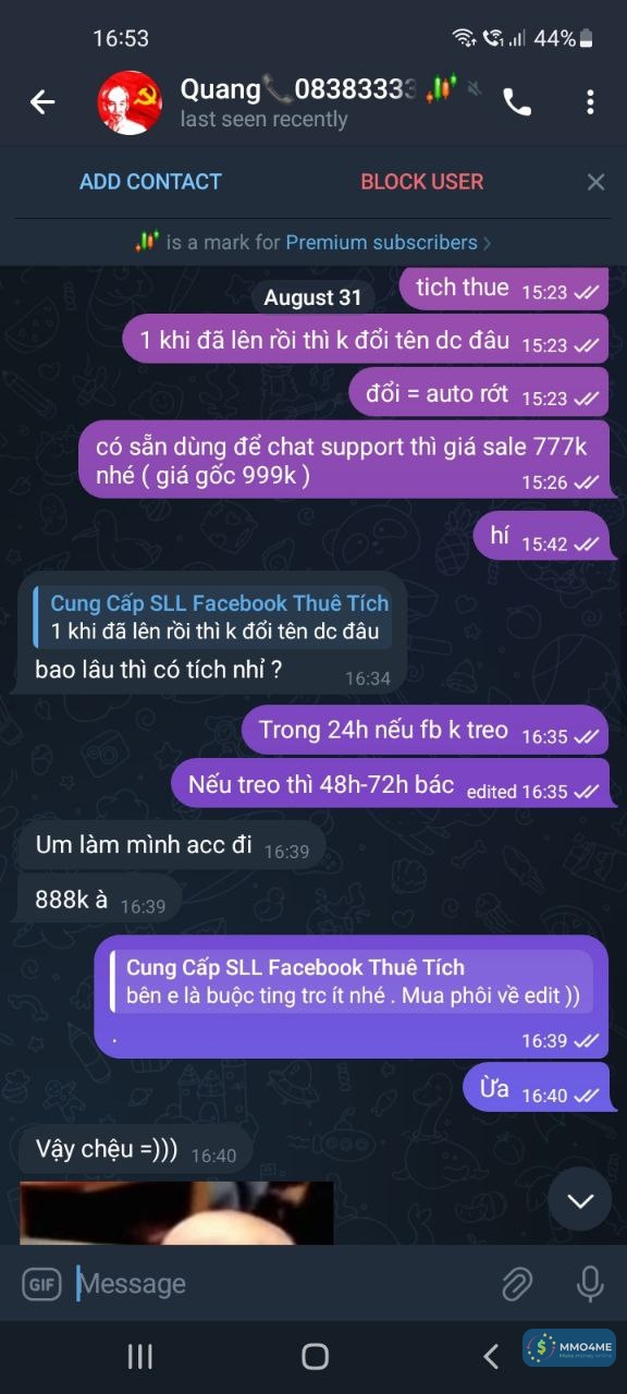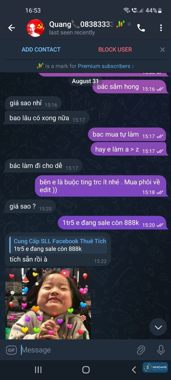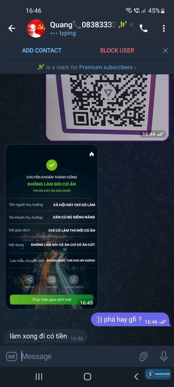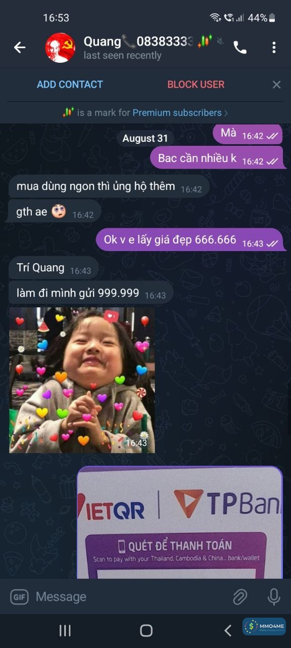 Đề Nghị bạn Đình Trí Quang ( Có cọc gdtg ở mmo4me ) xóa tất cả bài phốt ở các group kể cả group inapp + lên đính chính ở các group mà bạn đã từng phốt ở các group ( như mmo4me và 2 group inapp khác ) . Lúc đầu nó inbox e hỏi về giá lên tích xanh - lên acc đang dùng hay lên bằng via . Xong sau đó t có tư vân rồi nó kêu làm đi thì t cũng có nghe tính nó ntn nên kêu nó bank và có ném QR . Xong nó không chịu nó bảo nó có cọc mmo4me rồi có nói qua nói lại xong t cũng xuống nước bảo riêng nó thì t cân gd trực tiếp . Cài xong nó đi phốt bêu rếu t khắp các box chat tren telegram ( trong đó có box mmo4me ) . Rồi t xuống nước thêm lần nữa có quạo nói " bố thí " nó 1 con tích cái xong nó cũng tự ái bảo " làm đi t bank 999k " . Cả 2 cũng bình thường trở lại , xong trong lúc làm t có quên thay user cho nó mà lúc fb duyệt tích r thì k đổi dc user thì thằng Quang nó chửi " ngu " này kia nọ cac kiểu . Xong e cũng đổi . Đổi cũng thêm 1-2 via e cũng quên đổi user . Xong e lấy via cuối đổi username theo yeu cầu rồi chờ FB duyệt tích thì e có nói " lên tích xong con này rồi m xóa all post vs đính chính lại cho t " thì nó spam ticker của telepremium ( kiểu ko care ) . Xong lên xong giao cho nó + nó đòi mua lại 2 con tích đầu tiên bị tạch user , nó bank cọc 333k xong e giao cho no hết thì no bank nốt 666k còn lại . Và từ lúc done cho nó xong cho tới h nó im ru không 1 lời đính chính nào cả