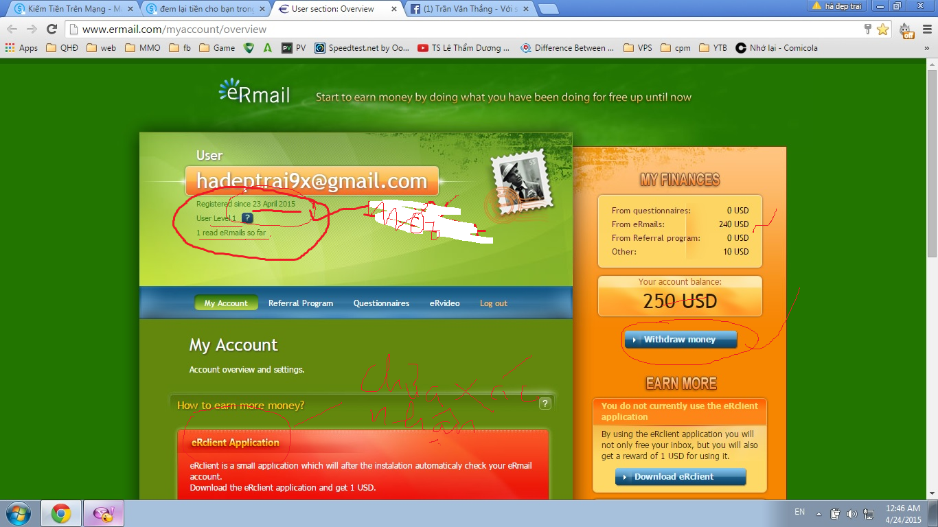 tớ chơi mới 3 ngày mới được nhiêu đó , tên kia mới đang ký cái rột , đọc có 1 mail mà 240 nhìn mà hài. đã vậy còn không xác nhận cái 1USD kia nữa