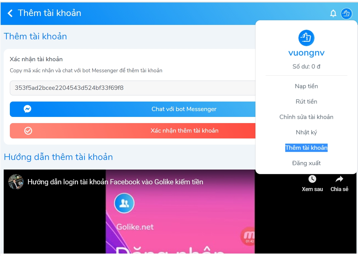 Nếu các bạn muốn kiếm tiền trên trình duyệt máy tính của các bạn cũng rất đơn giản, sau khi đăng nhập các bạn vào menu và bấm thêm tài khoản
