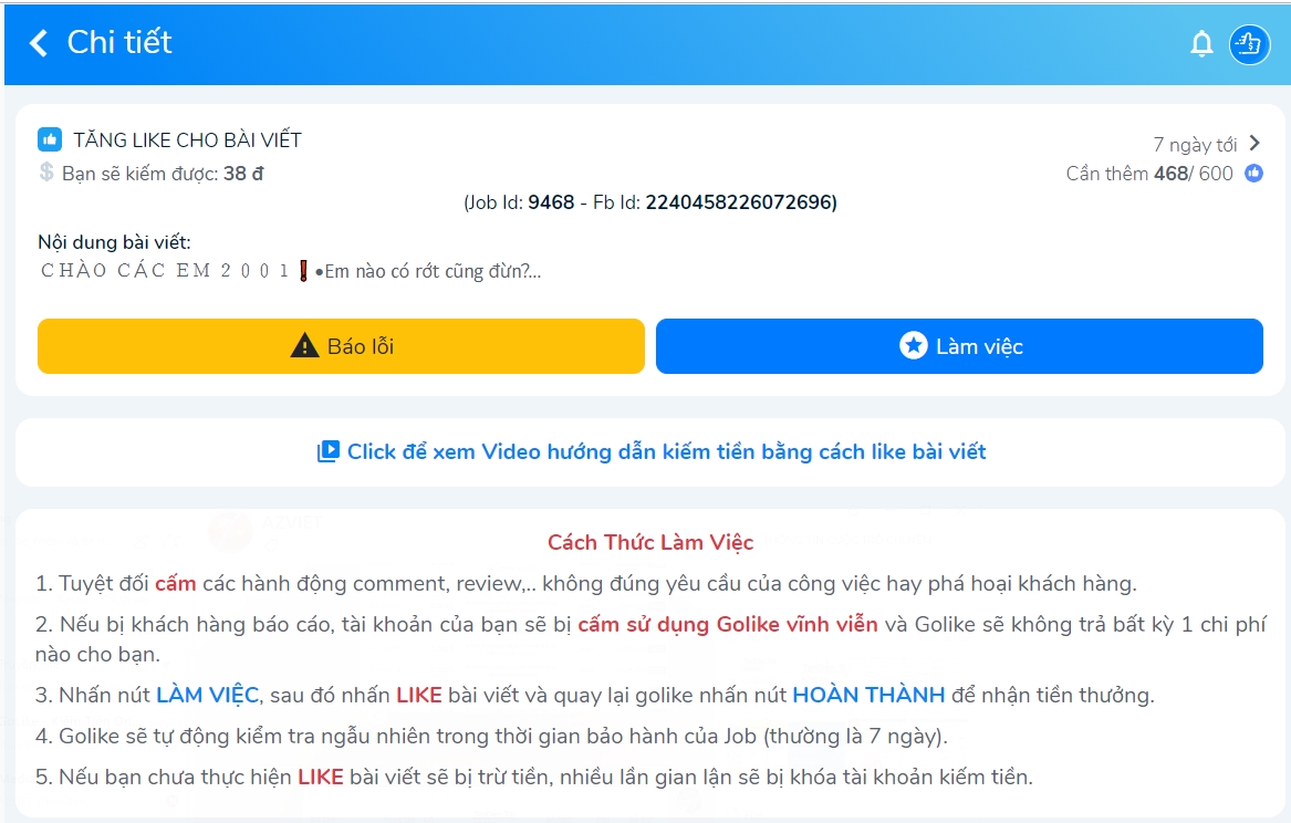 Sẵn đây mình nói một lần để đỡ tranh luận nhé. Golike là một phương thức kiếm tiền thực sự. Nó ko giúp các bạn giàu nhưng các có thể kiếm tiền tiêu vặt trong lúc rảnh rỗi thay vì ko ai trả đồng nào cho các bạn trong lúc các bạn rảnh. Nếu bạn nào có sự nghi ngờ thì các bạn có thể không làm. Chẳng phải mình bắt các bạn nạp tiền mà phải hoạch họe như đúng rồi. Có tiền để xài, lại miễn phí mà còn không nắm bắt thì chịu rồi. Vậy nhé. Thân