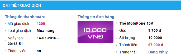 Mình có mua thẻ bên đây, odder đơn hàng đầu tiên 10 thẻ mobi thì ok, m odder tiếp 10 thẻ nữa cũng mobi, mà từ 8h tối tới giờ vẫn đang xử lý, m có gọi điện hỏi thì bảo chờ tý đang bên ngoài, đến giờ là quá trễ, với mình, mình thì lại đang cần trong thời gian lúc đó