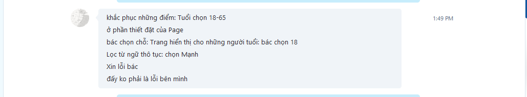 Sau khi mua chạy được 0,4$ tài khoản bị cắm cờ , mình có nhờ giải quyết cậu ấy chốt câu quyết định đại loại vi phạm vì target dưới 18 tuổi.