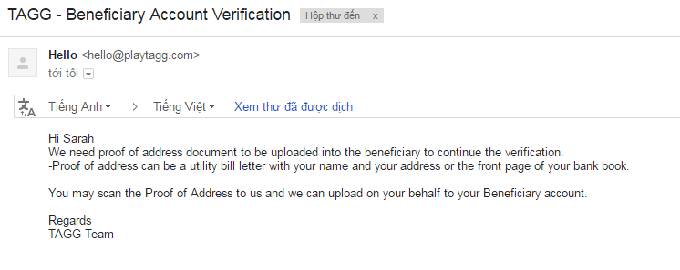 Code:Hi Sarah We need proof of address document to be uploaded into the beneficiary to continue the verification. -Proof of address can be a utility bill letter with your name and your address or the front page of your bank book. You may scan the Proof of Address to us and we can upload on your behalf to your Beneficiary account. Regards TAGG Team