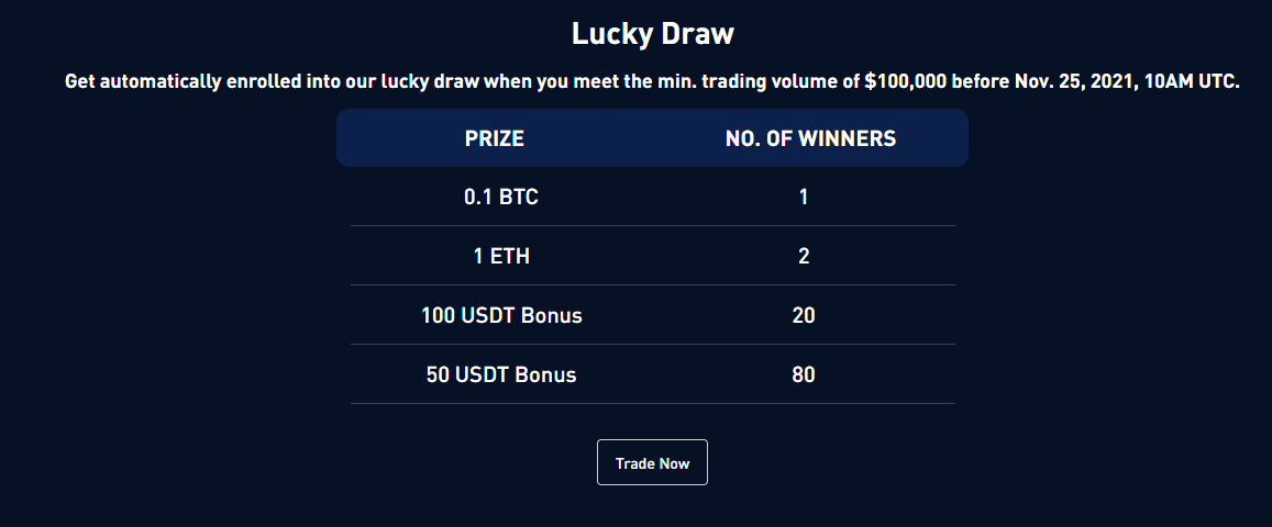 5. Ngoài ra, anh em còn được tham gia bốc thăm may mắn cơ hội trúng 0.1 BTC, 1 ETH, nhiều giải 50, 100 $ từ chính Bybit khi khối lượng giao dịch derivatives của anh em trên 100k$ ( trước ngày 25/11) ( Đạt vol này rất dễ nhé, mình trade một tài khoản 3k$ nhưng vol đã 500k$ trong mấy ngày)
