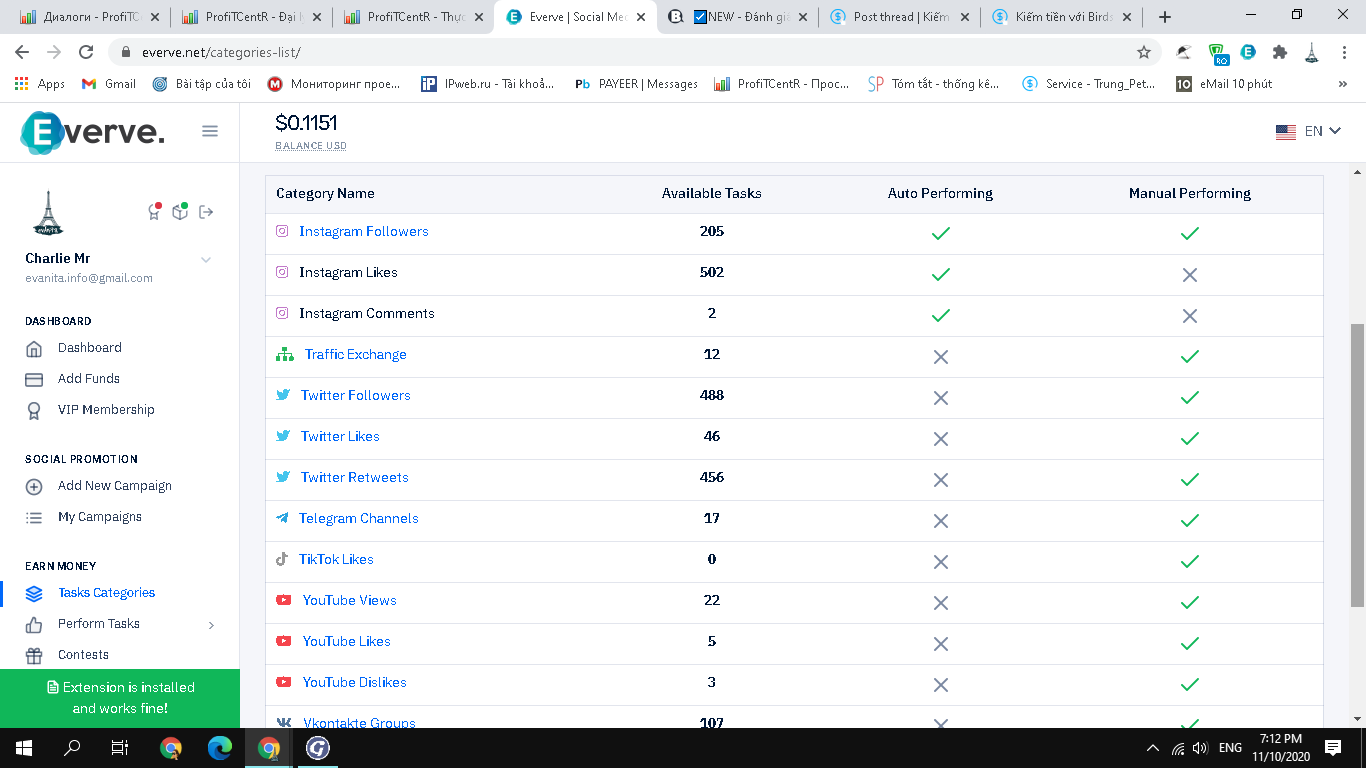 Everve là trang kiếm tiền qua like, follow twitter, instagram, youtube, vkontakte, tik tok,...