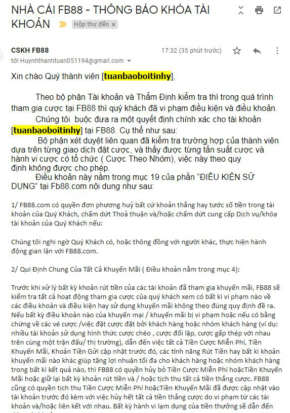 Tuy nhiên sau khi tìm hiểu thông tin thì mới phát hiện ra sự việc không phải như chủ thớt trình bày. Thực chất người chơi này đã vi phạm điều khoản 19 của nhà cái fb88 nên tài khoản bị khóa không riêng gì nhà cái fb88 mà những nhà cái khác cũng có quy định này.