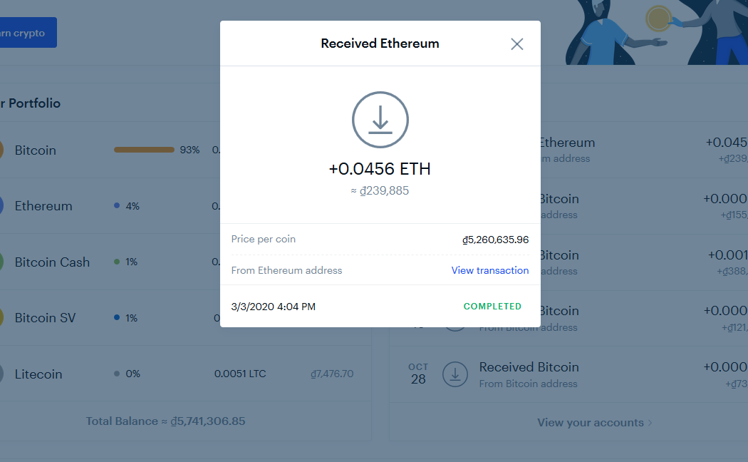 You just received 0.0160 ETH (₫147,112 VND) from an external Ethereum account. It may take up to 35 network confirmations before your Ethereum is available to trade.​