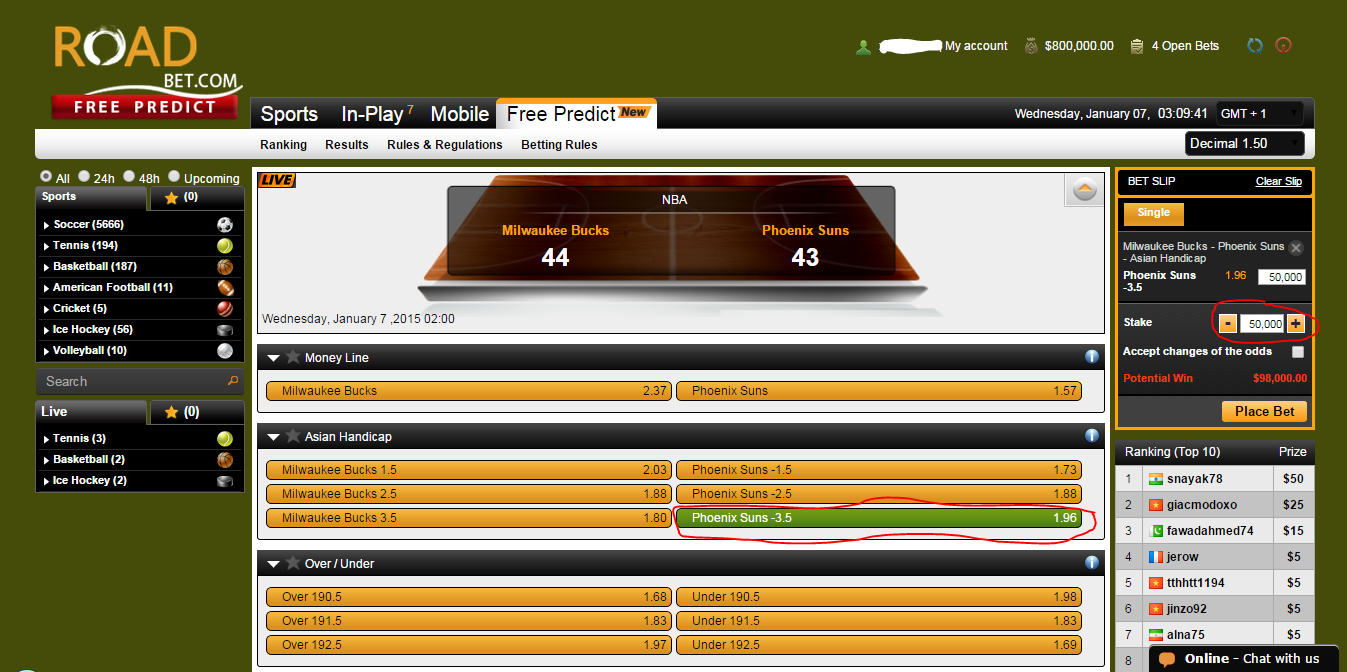 Bước 3: Chọn 1 trận đấu trong phần Free Predict và đặt cược thôi. Số tiền cược tối thiểu là 5.000$ và tối đa 50.000$ cho 1 vé cược.