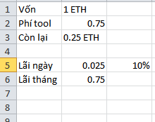 Ví dụ vốn ở đây 1 ETH, lãi 10%/ ngày đi. như ta thấy thì chỉ đủ tiền phí tool. Để có lãi thì phải đầu tư hơn 1 ETH. Hiểu chưa bácView attachment 136589