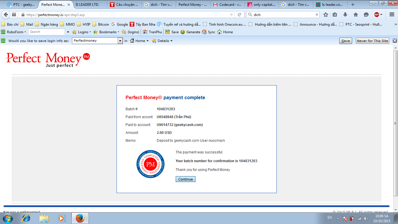 The amount of 2 USD has been withdrawn from your Perfect Money account. Accounts: U8908492->U9014732. Memo: Shopping Cart Payment. Deposit to geekycash.com User lucky35.. Date: 04:14 10.10.15. Batch: 104830103.