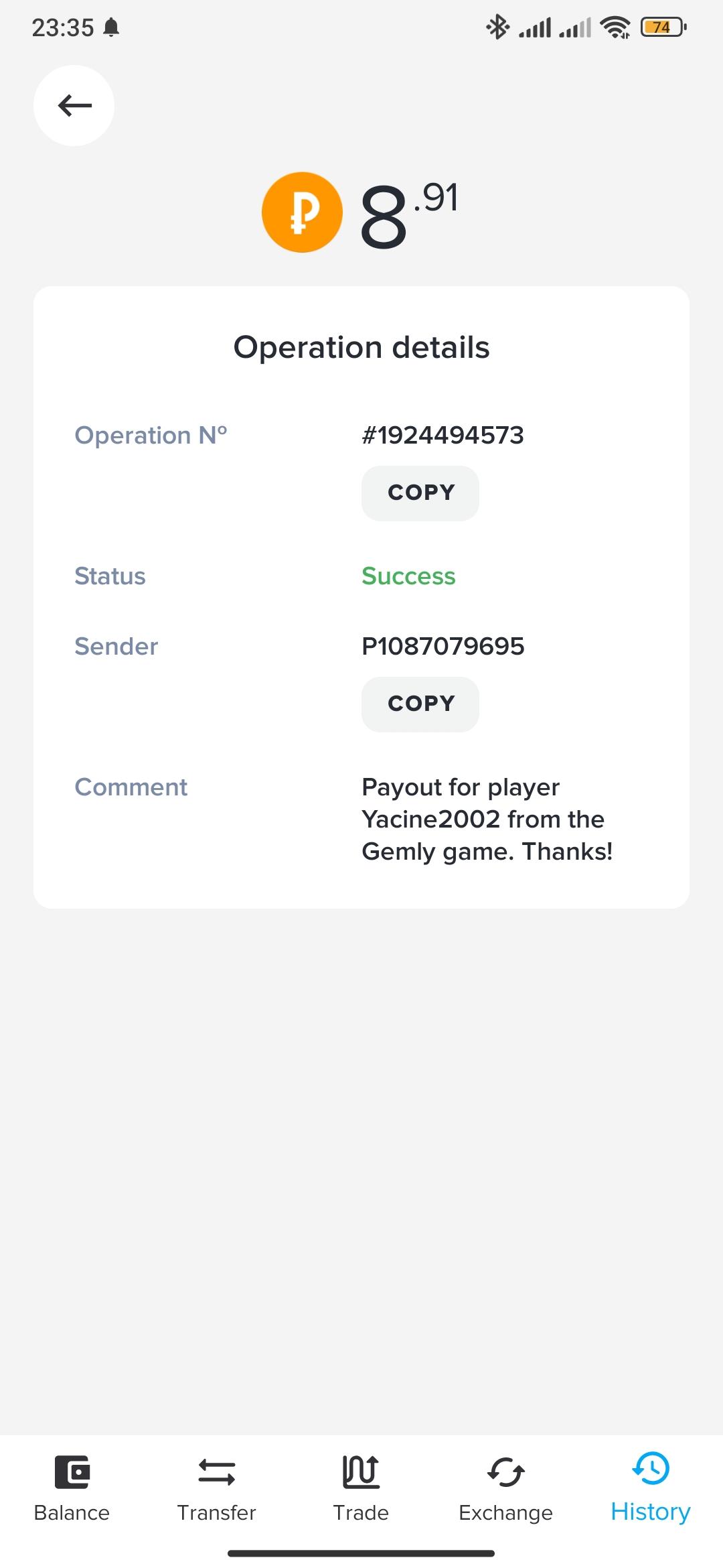 Comment: Pago para el jugador burvega del juego Gemly. ¡Gracias!