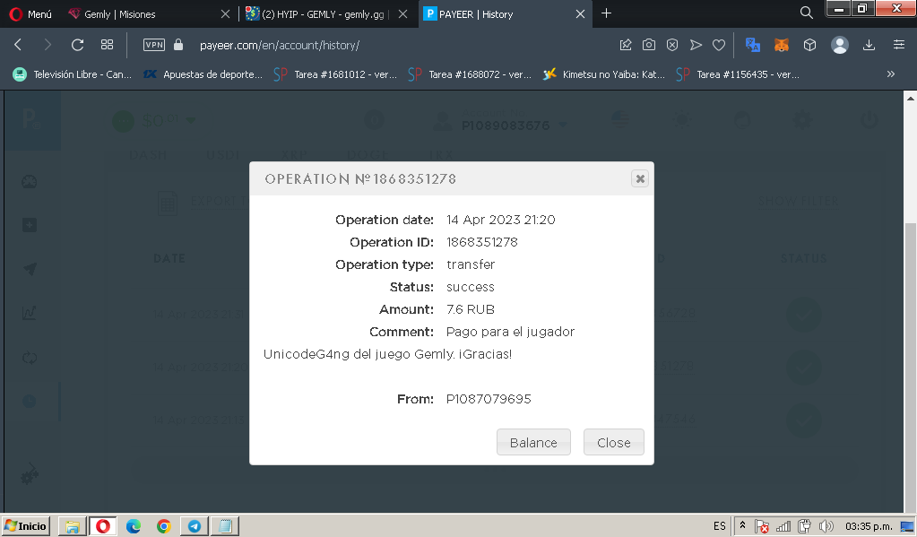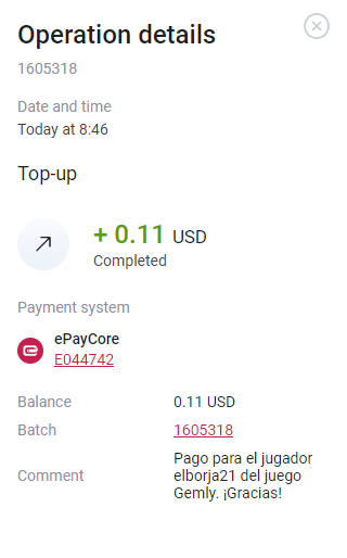 Comment: Pago para el jugador UnicodeG4ng del juego Gemly. ¡Gracias!