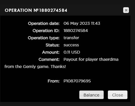 Comment: Pago para el jugador mikver del juego Gemly. ¡Gracias!