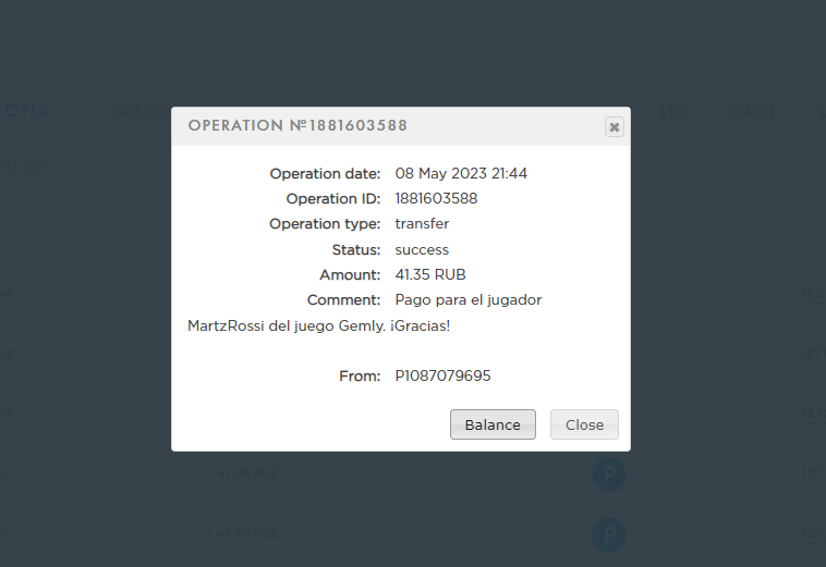 Comment: Pago para el jugador Maxspeed del juego Gemly. ¡Gracias!