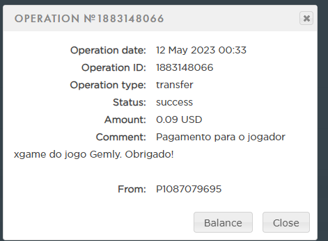 Comment: Pago para el jugador Jufemo del juego Gemly. ¡Gracias!