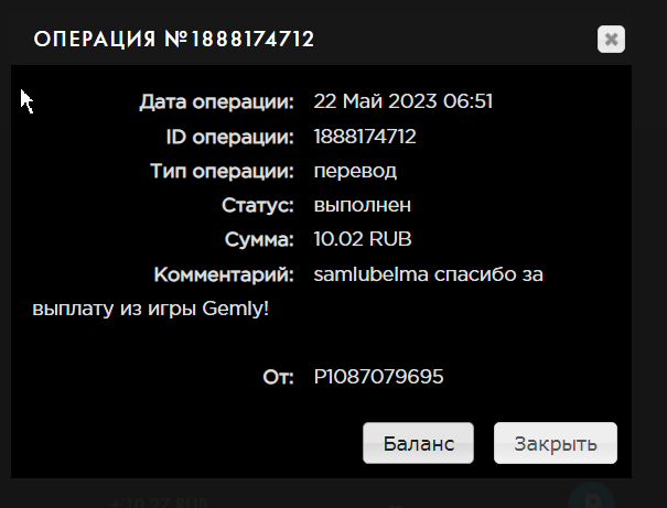 Комментарий: TMFeS спасибо за выплату из игры Gemly!