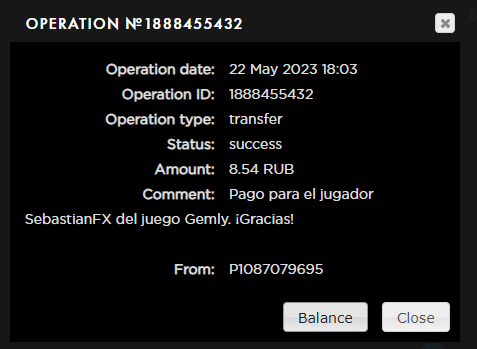 Comment: Pago para el jugador mikver del juego Gemly. ¡Gracias!