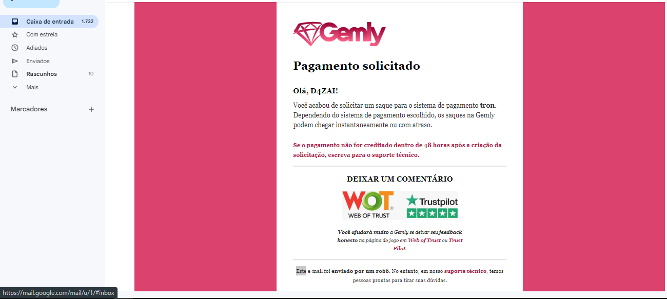 Comentario: Pago para el jugador LuisEmprende del juego Gemly. ¡Gracias!