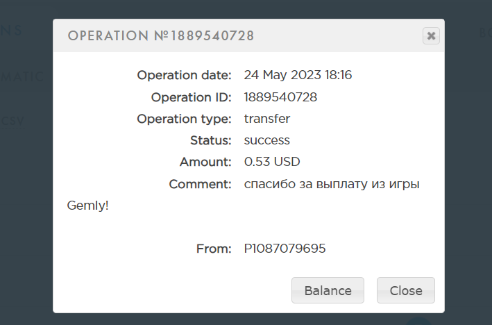 Comment: Pago para el jugador Maxspeed del juego Gemly. ¡Gracias!