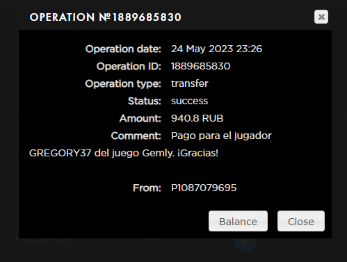 Comment: Pago para el jugador Jufemo del juego Gemly. ¡Gracias!