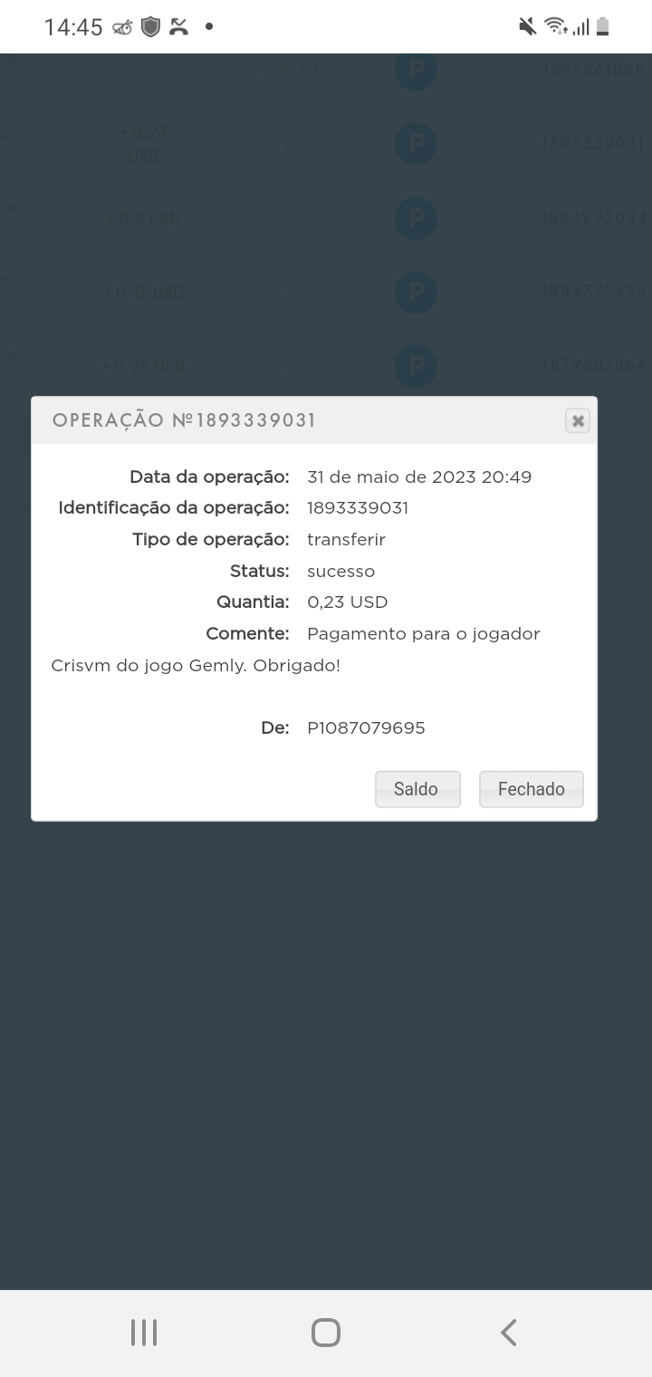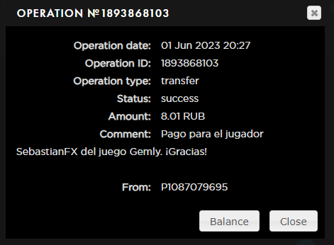 Comment: Pago para el jugador burvega del juego Gemly. ¡Gracias!