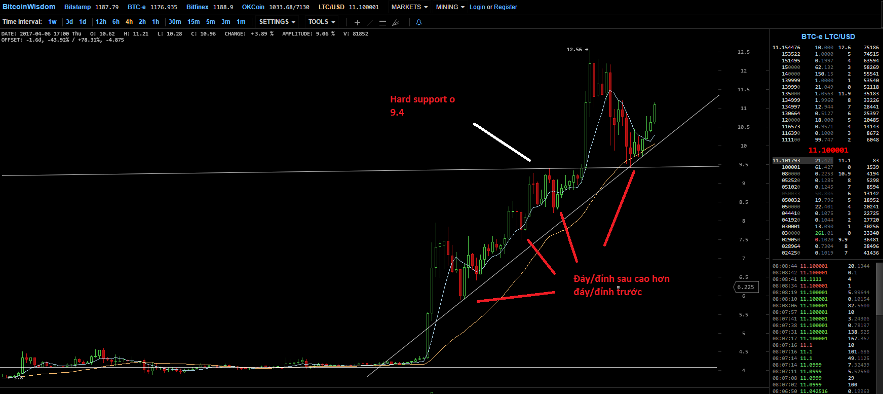 LTC test lại support 9.4 và đã test thành công, xu hướng giờ là giao dich quanh vùng 10.5 - 11.9, mình dự là thứ 2 sẽ break được 12, nếu break 12 thì điểm rung lắc tiếp theo sẽ là 18-20$, điểm này khá nhạy cảm nên ae nếu chơi nhiều thì nên chốt bớt 70-90% lãi, để lại 1 ít làm BITCOIN DREAM thôi :D, Mình có attach chart trong bài viết, ae tham khảo